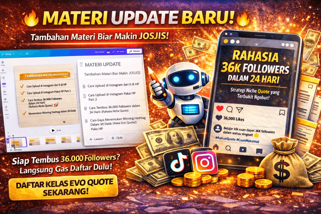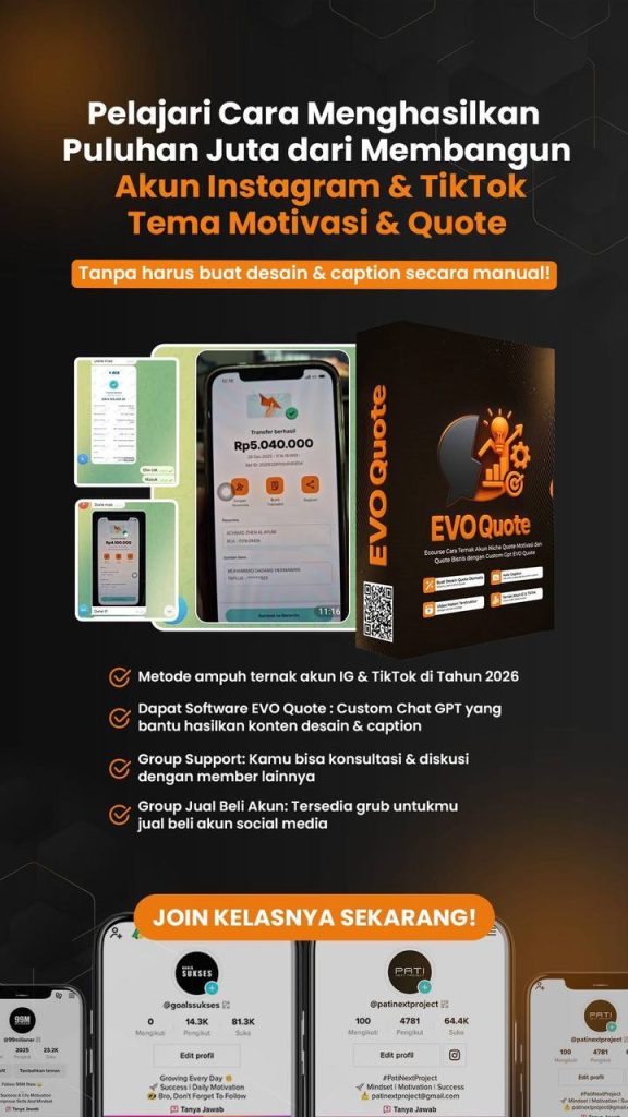 Kelas Online yang mengajarkan cara ternak akun Instagram & TikTok bertema quote motivasi dan quote bisnis.